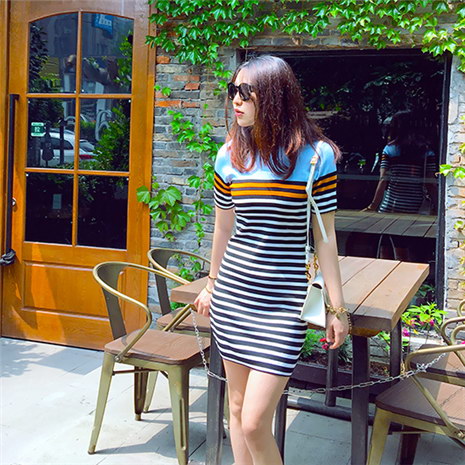 条纹冰丝针织中长款连衣裙